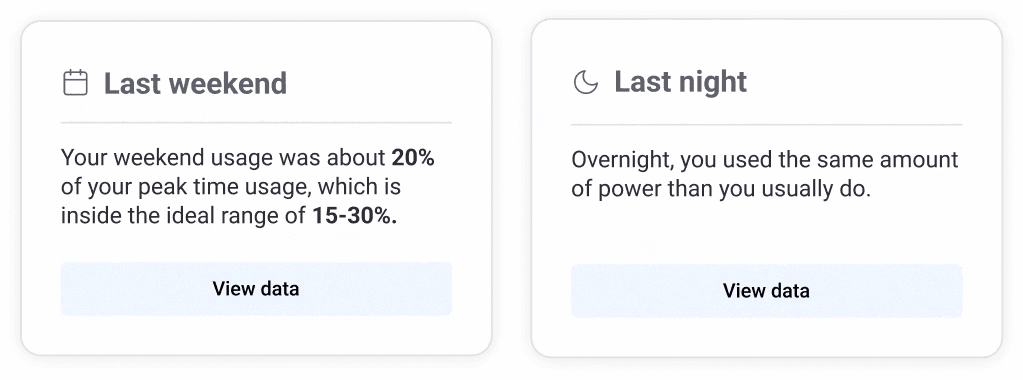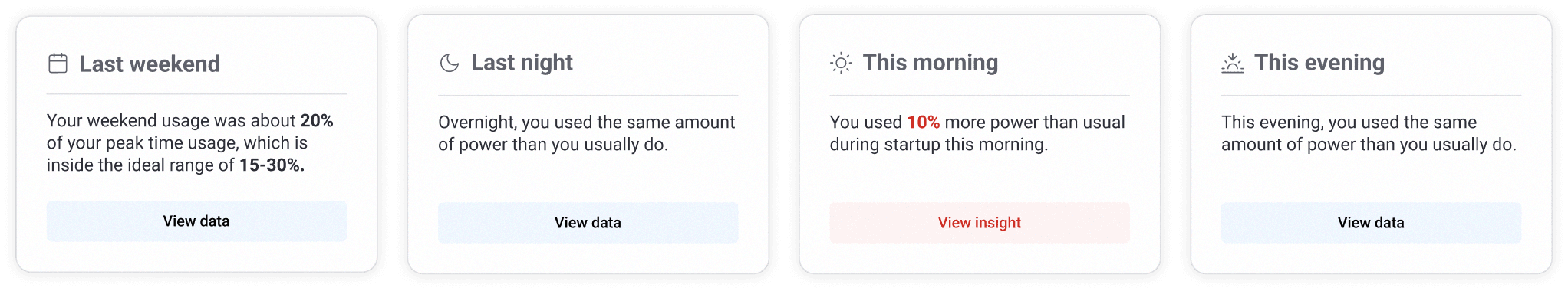 The buttons on each card map to an insight icon on the graph below. Insights — observations based on either similar buildings or historical data — are available for every time frame.