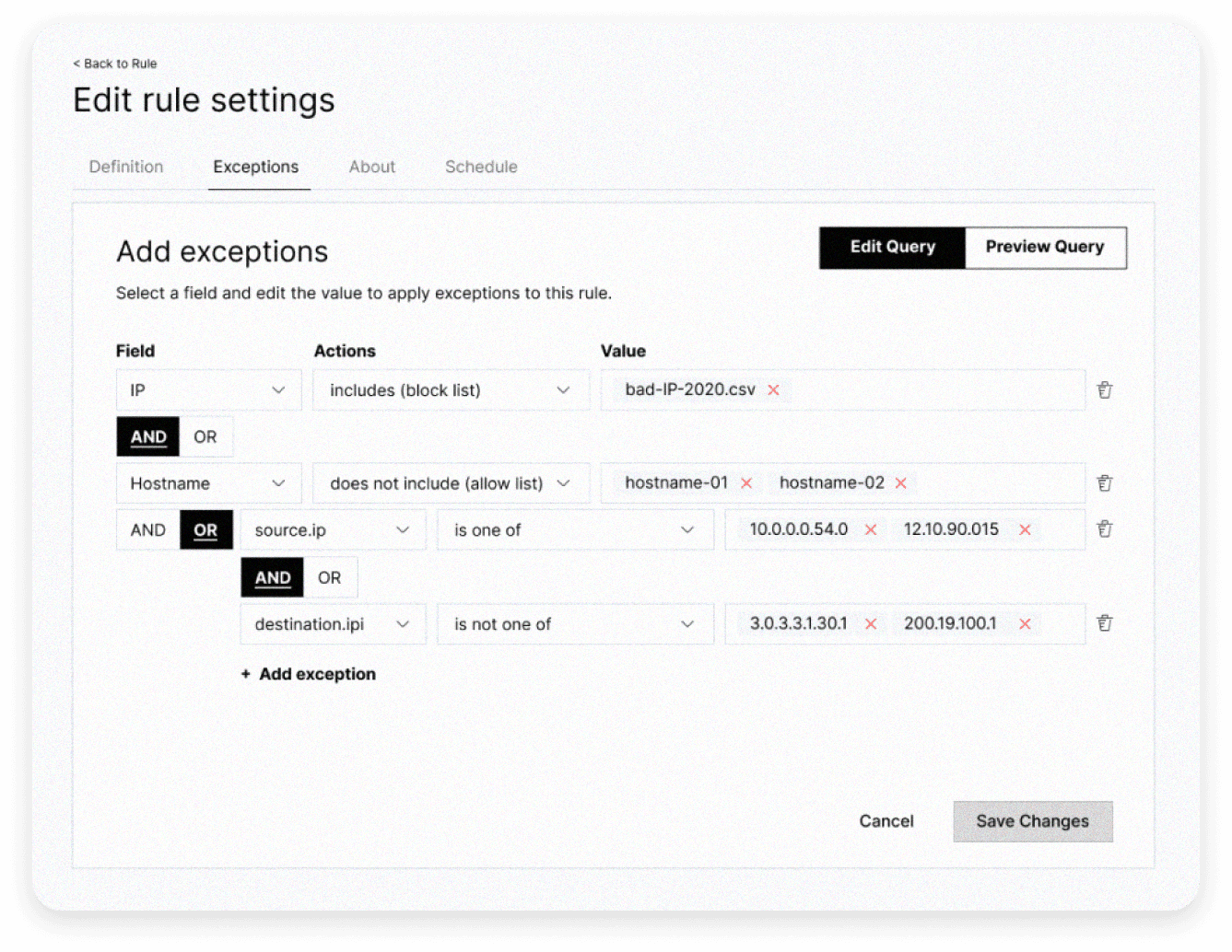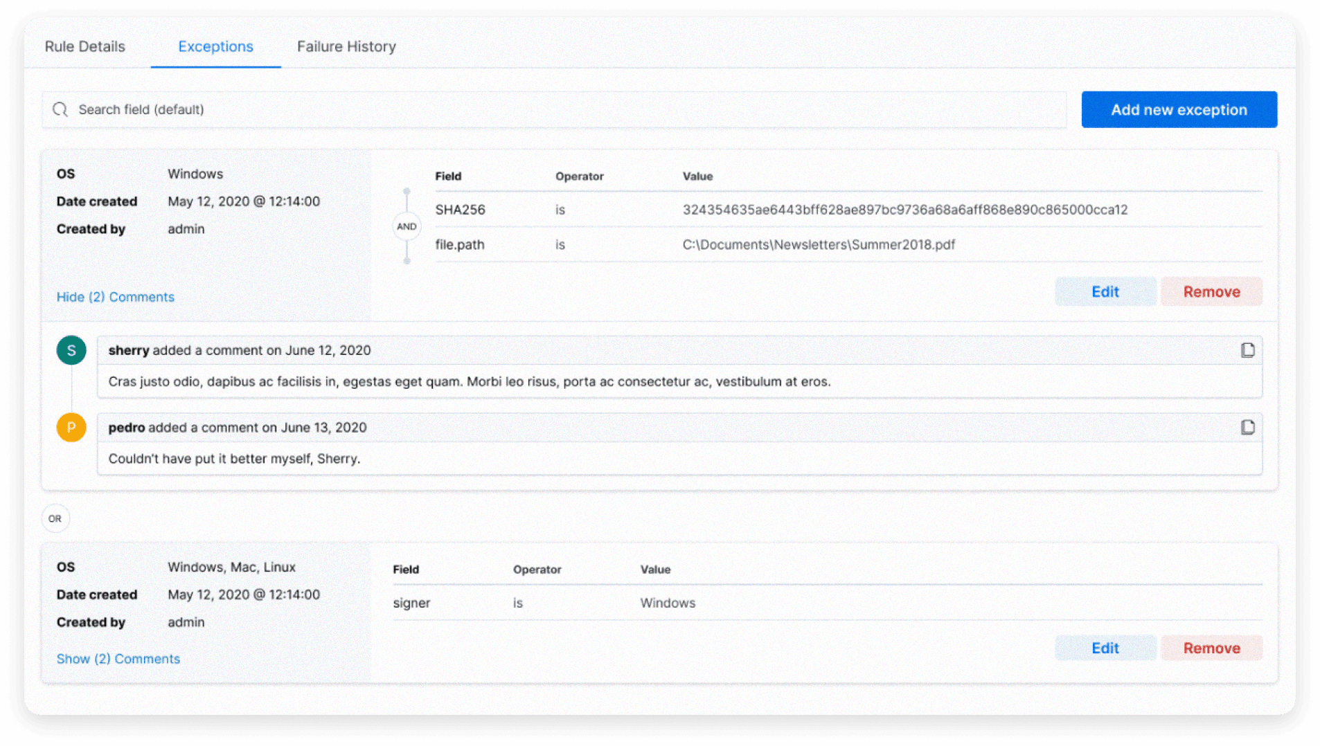 Allow users to add exceptions to to Elastic prebuilt rules in order to fine tune their detection engine and reduce false positives.